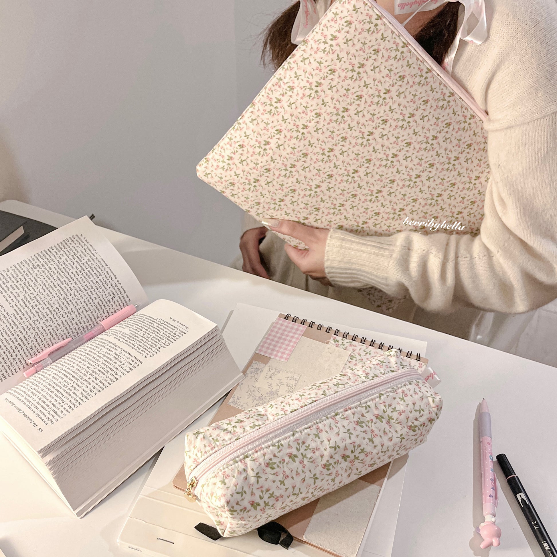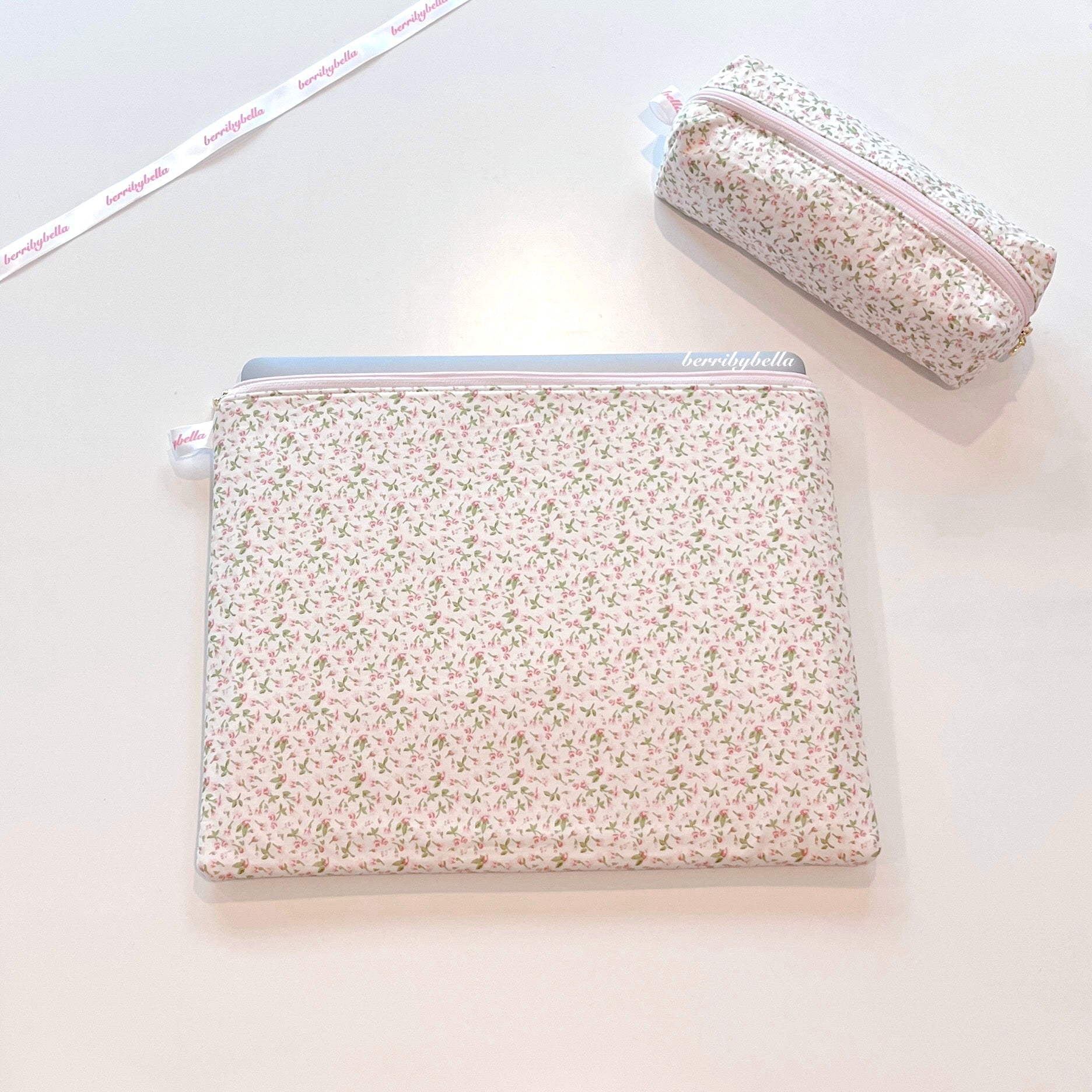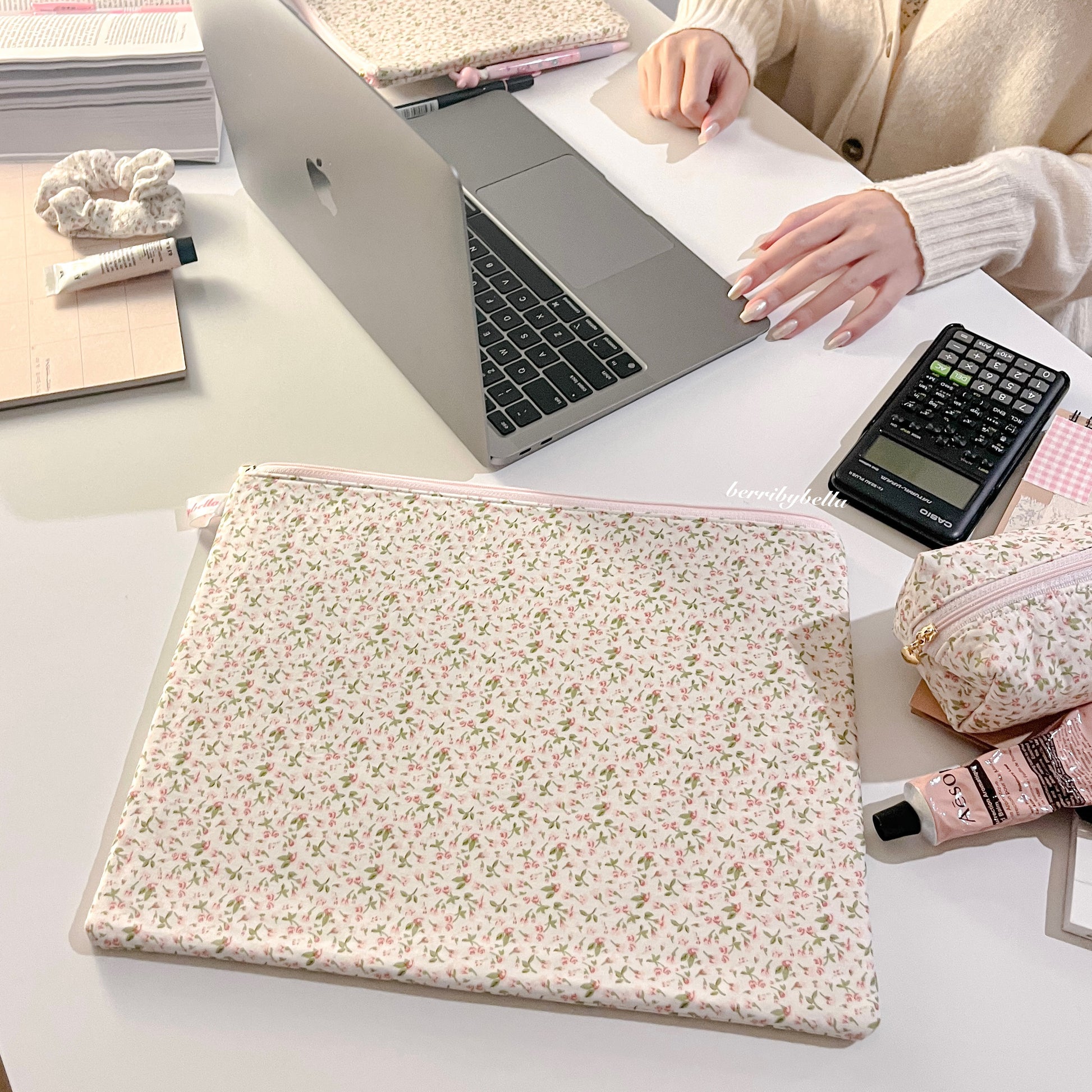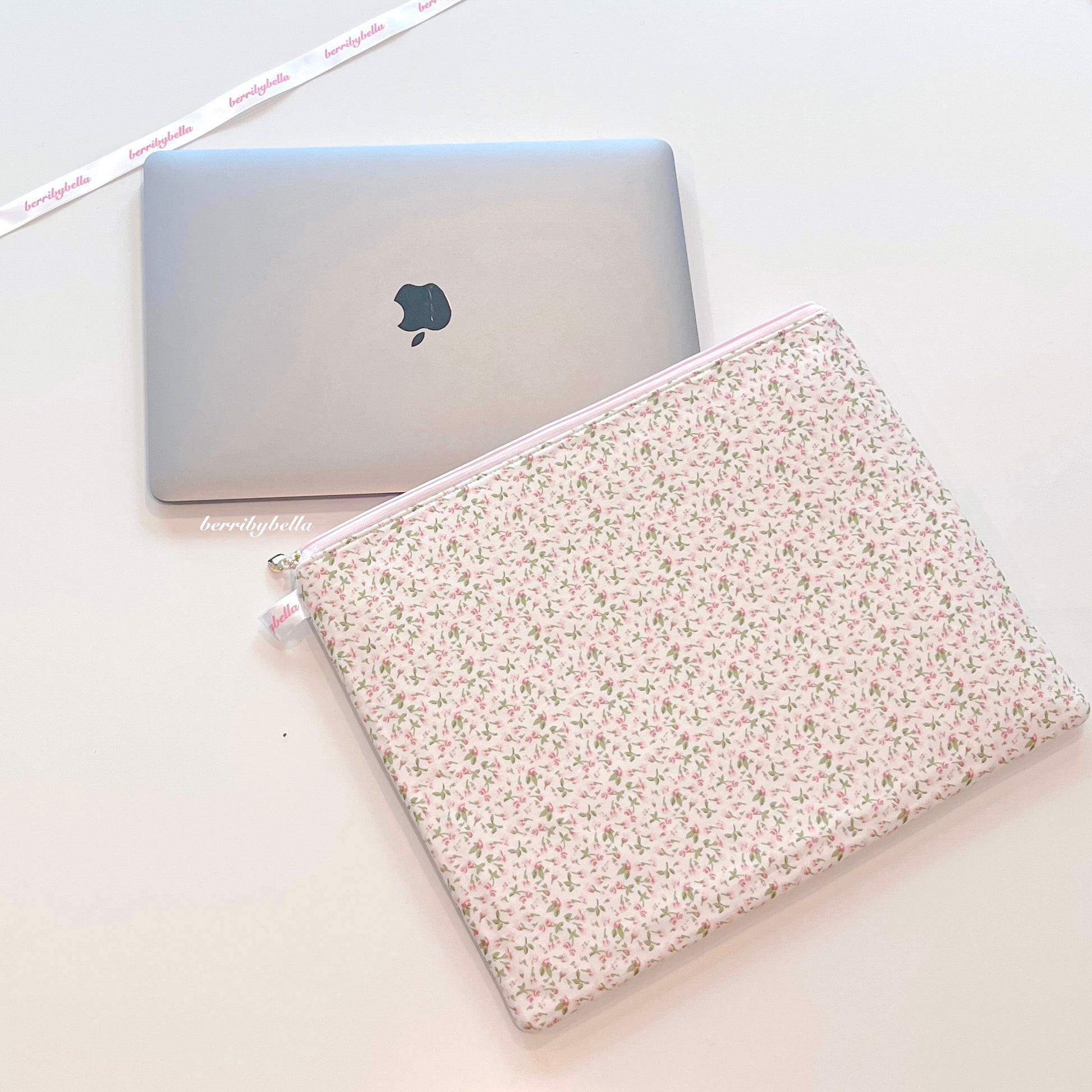 The classic floral laptop sleeve is lined with pink gingham fabric and comes with gold-plated heart zipper, super cute and high quality.